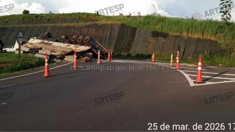 Carreta carregada com telhas tomba na SP-333 em Júlio Mesquita e motorista fica ferido