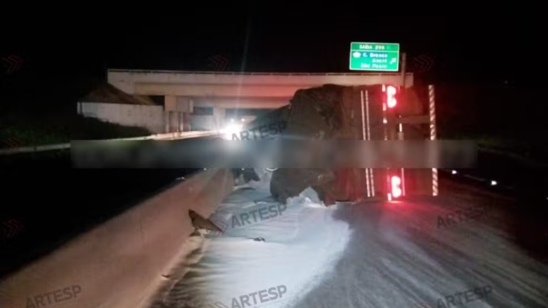 Carreta tomba e espalha carga de sal na SP-225 em Santa Cruz do Rio Pardo