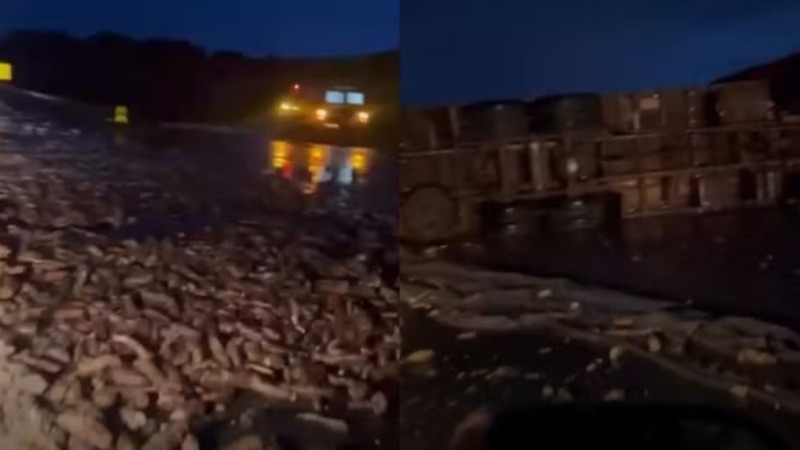 Caminhão carregado com mandioca tomba na Rodovia Raposo Tavares e interdita trecho em Assis