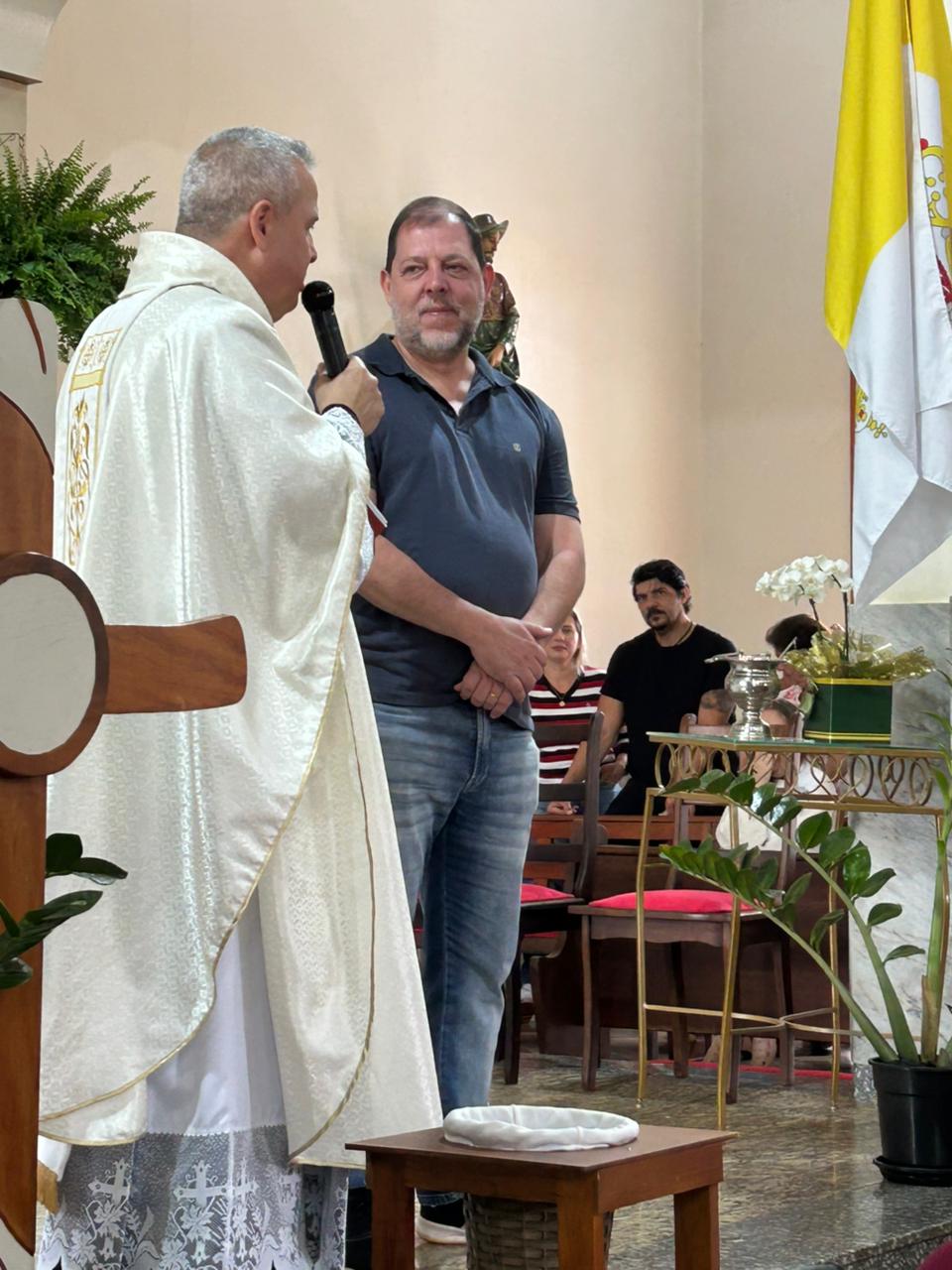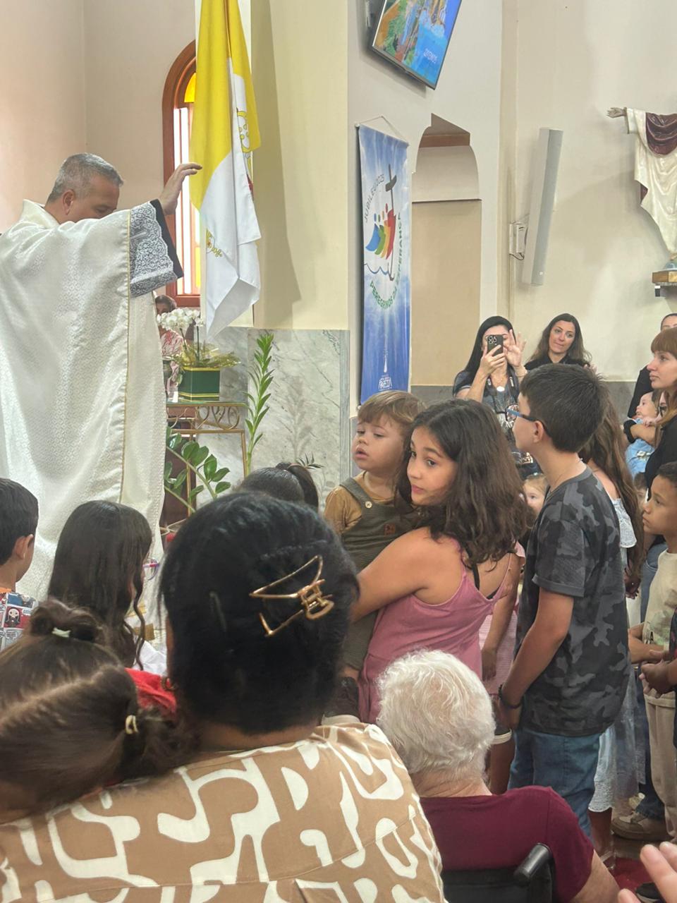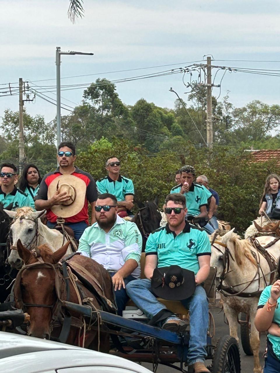 A programação incluiu a celebração da Santa Missa, seguida pela bênção das crianças e dos cavaleiros participantes da tradicional Cavalgada de Nossa Senhora Aparecida, evento que faz parte do calendário religioso local.