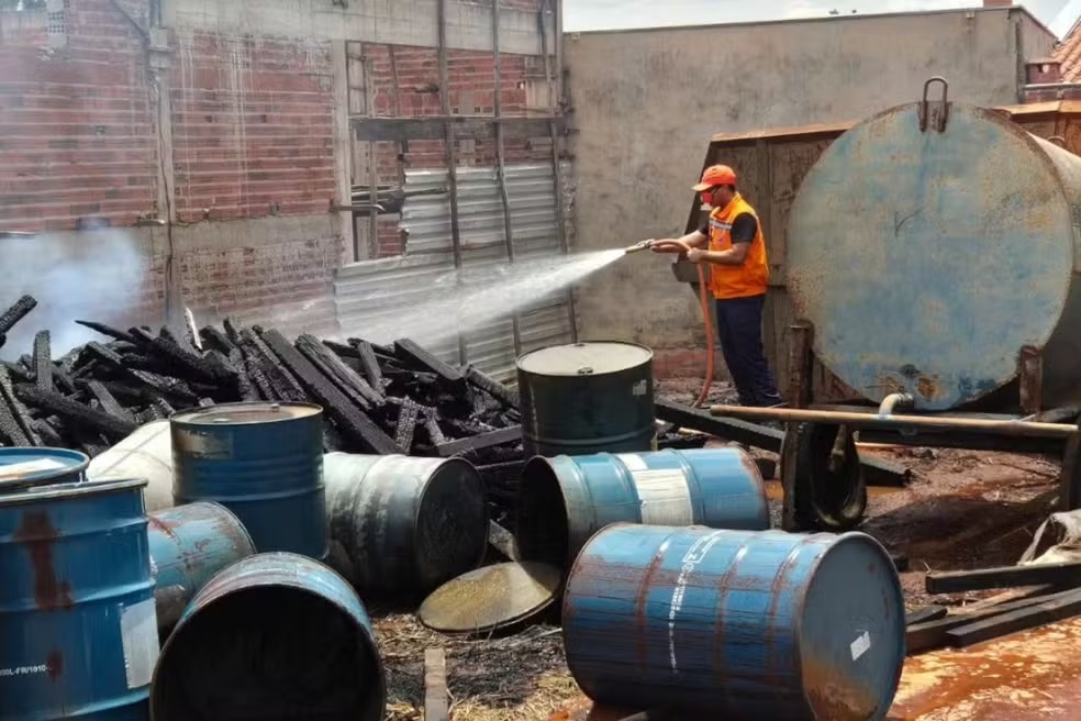 Segundo informações preliminares, o incêndio teve início durante trabalhos de soldagem, e o depósito continha madeiras, latões de óleo e outros materiais combustíveis, o que dificultou o controle das chamas.