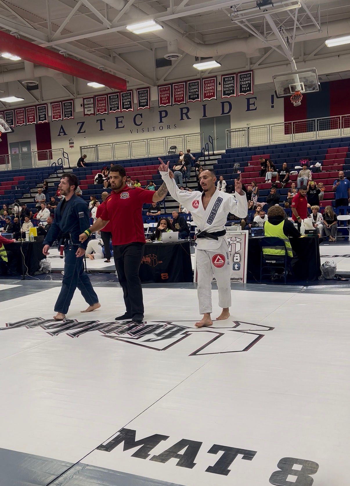 Representando a tradicional Gracie Barra Chula Vista, Carlos também destacou o orgulho de levar o nome da equipe Silvano Silva Team, fundada em São Manuel, que o acompanha desde o início da trajetória no jiu-jitsu.
