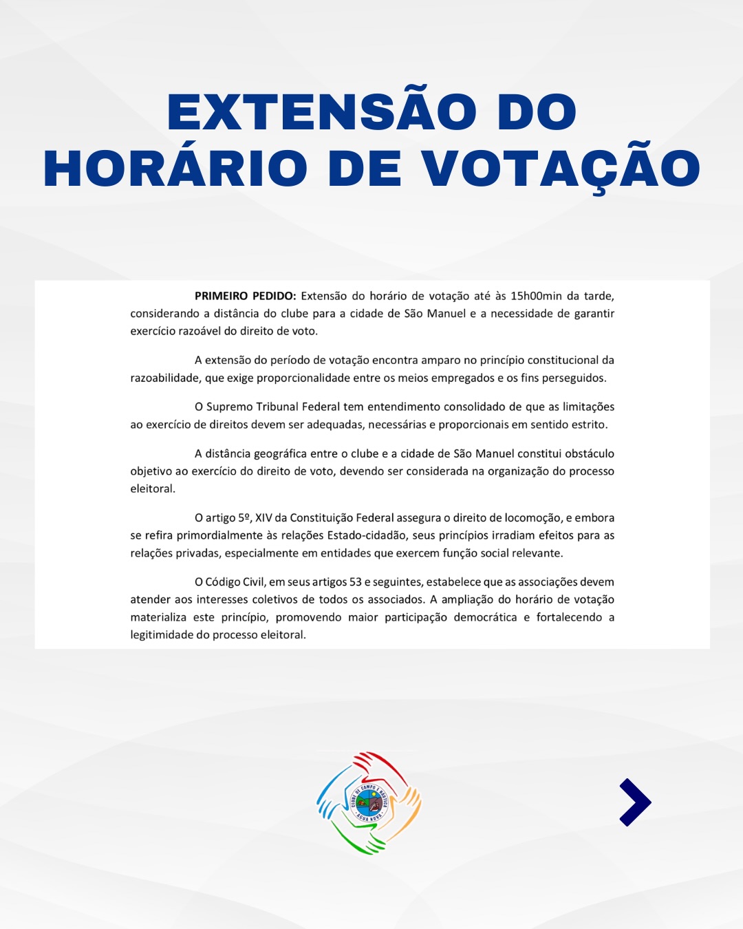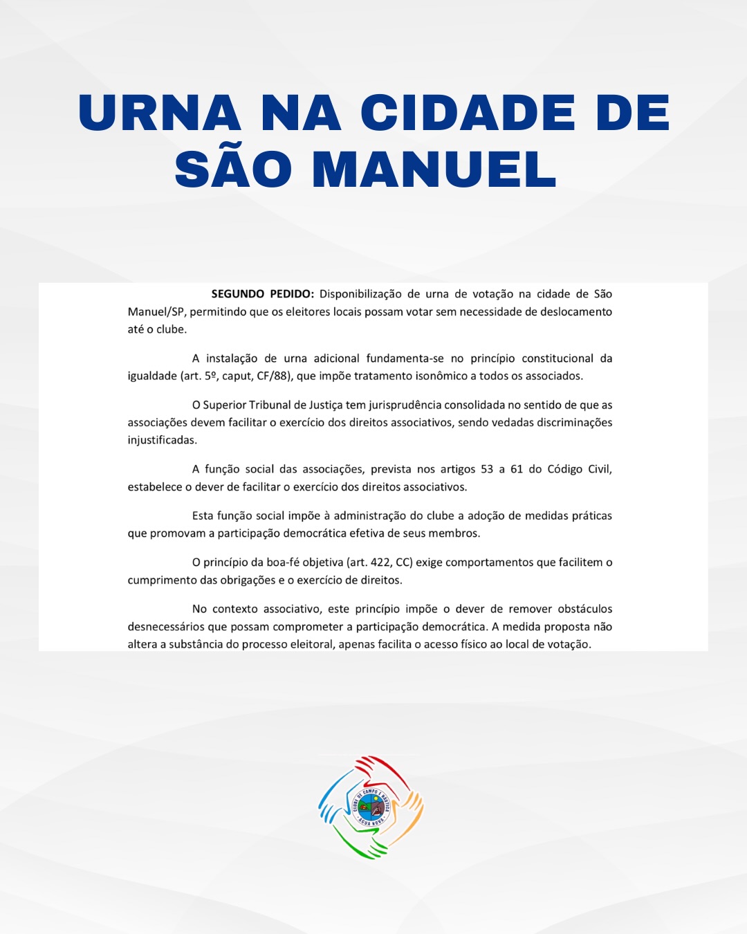 Entre os pedidos estavam a extensão do horário de votação até as 15h e a instalação de uma urna na cidade de São Manuel, propostas que, segundo a chapa, visavam facilitar o acesso dos associados ao pleito.