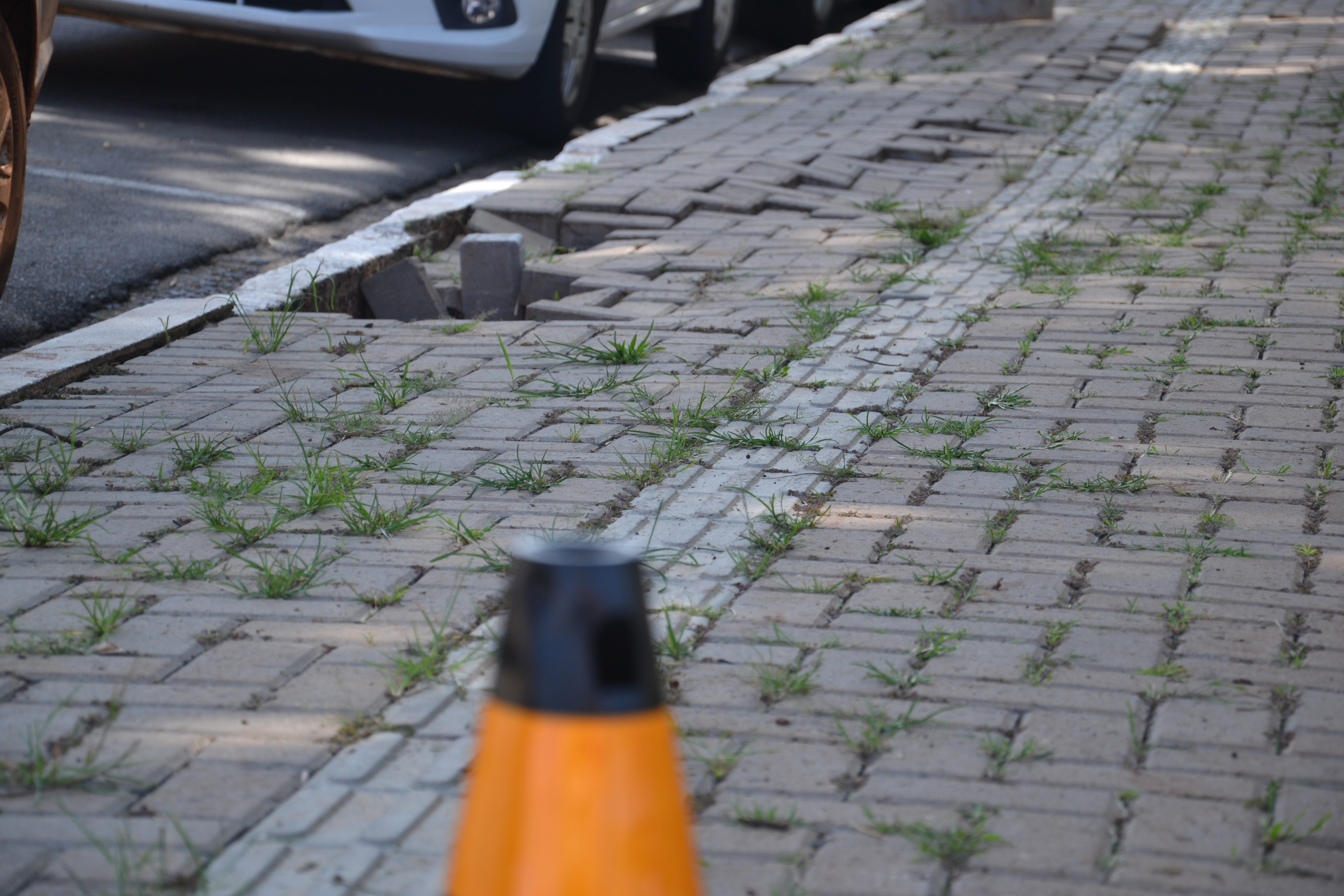 Uso inadequado de bloquetes: além de destoarem da estética histórica do santuário, os blocos foram instalados sem rejuntamento adequado e sobre uma base mal compactada. Como resultado, surgiram frestas onde o mato cresceu rapidamente, dificultando a manutenção e prejudicando a aparência do local.