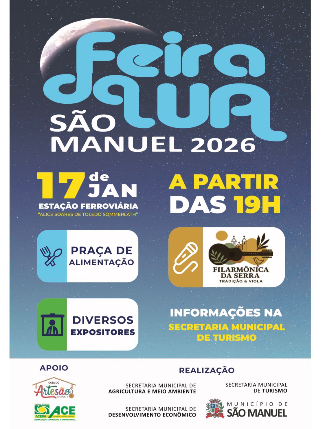 A Secretaria de Turismo de São Manuel, em conjunto com as pastas de Desenvolvimento Econômico e Agricultura, inicia nesta edição a Feira da Lua. O projeto piloto, sediado na Estação Ferroviária, é realizado em cooperação com a ACESM e a Casa do Artesão com o objetivo de criar um novo ponto de comercialização para empreendedores do município.