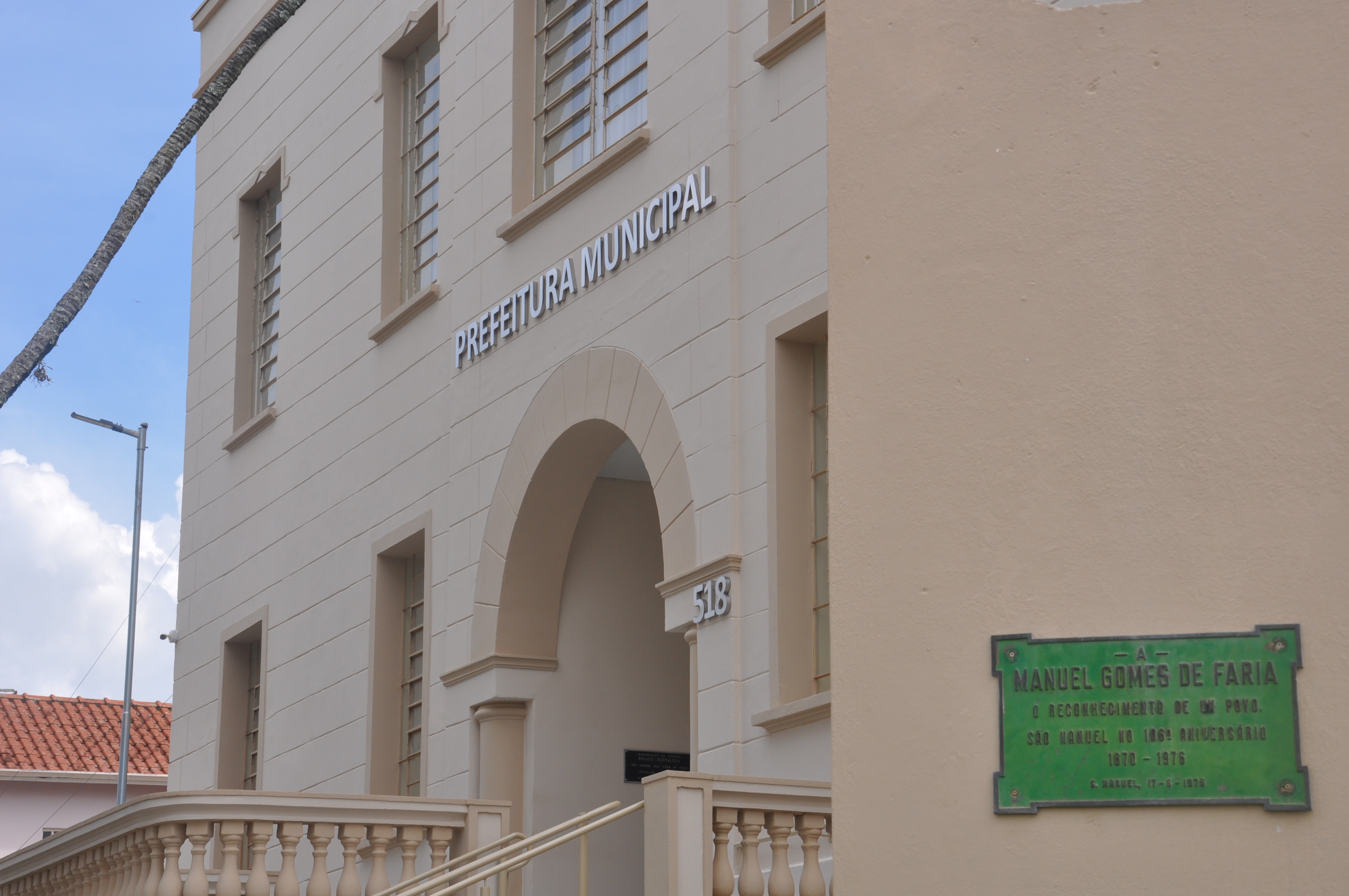 (Foto ilustra a fachada do prédio da Prefeitura de São Manuel. Imagem: Moisés Moura.)