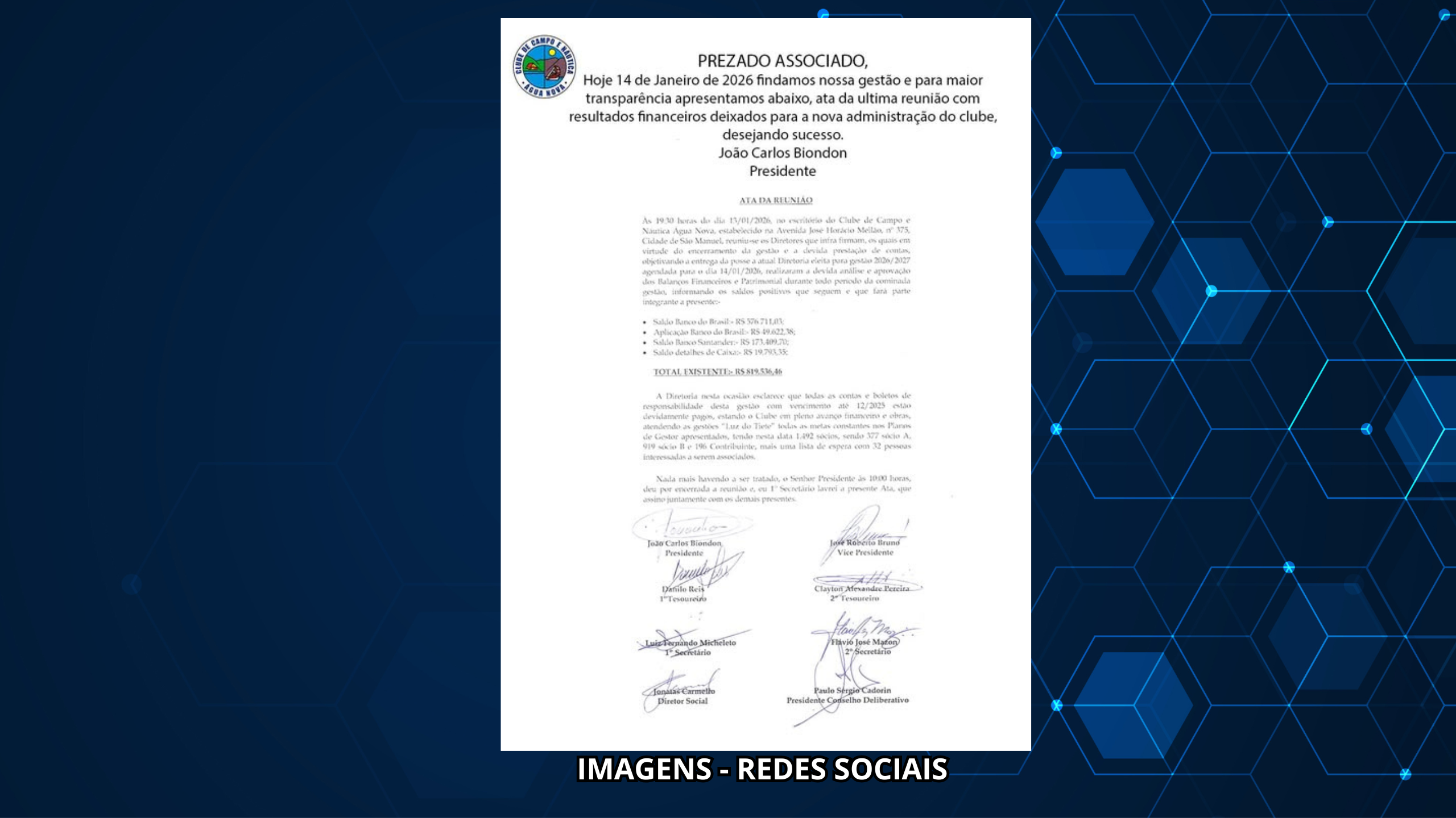 A diretoria do Clube de Campo e Náutica Água Nova, em São Manuel (SP), encerrou oficialmente sua gestão na terça-feira (14), apresentando o balanço financeiro e patrimonial que será entregue à nova administração eleita para o biênio 2026/2027.