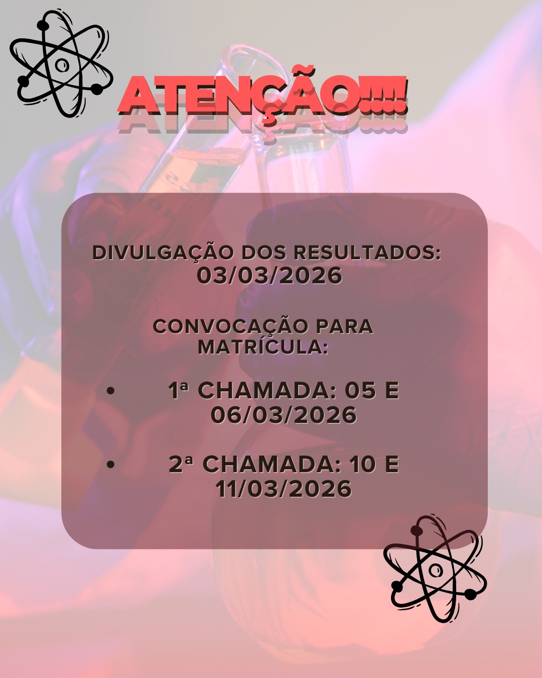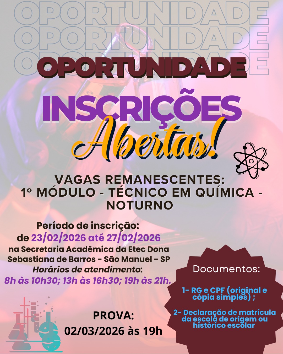 A direção da escola reforça que esta é uma oportunidade para quem deseja ingressar em uma formação técnica na área de Química, ampliando as chances de inserção no mercado de trabalho.