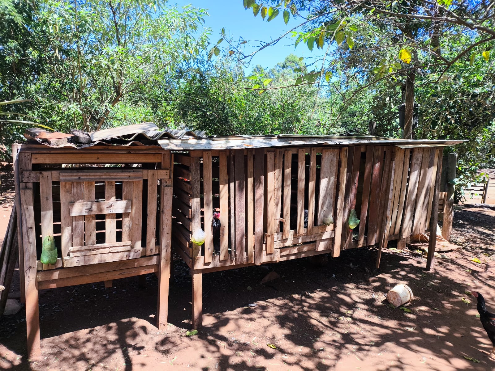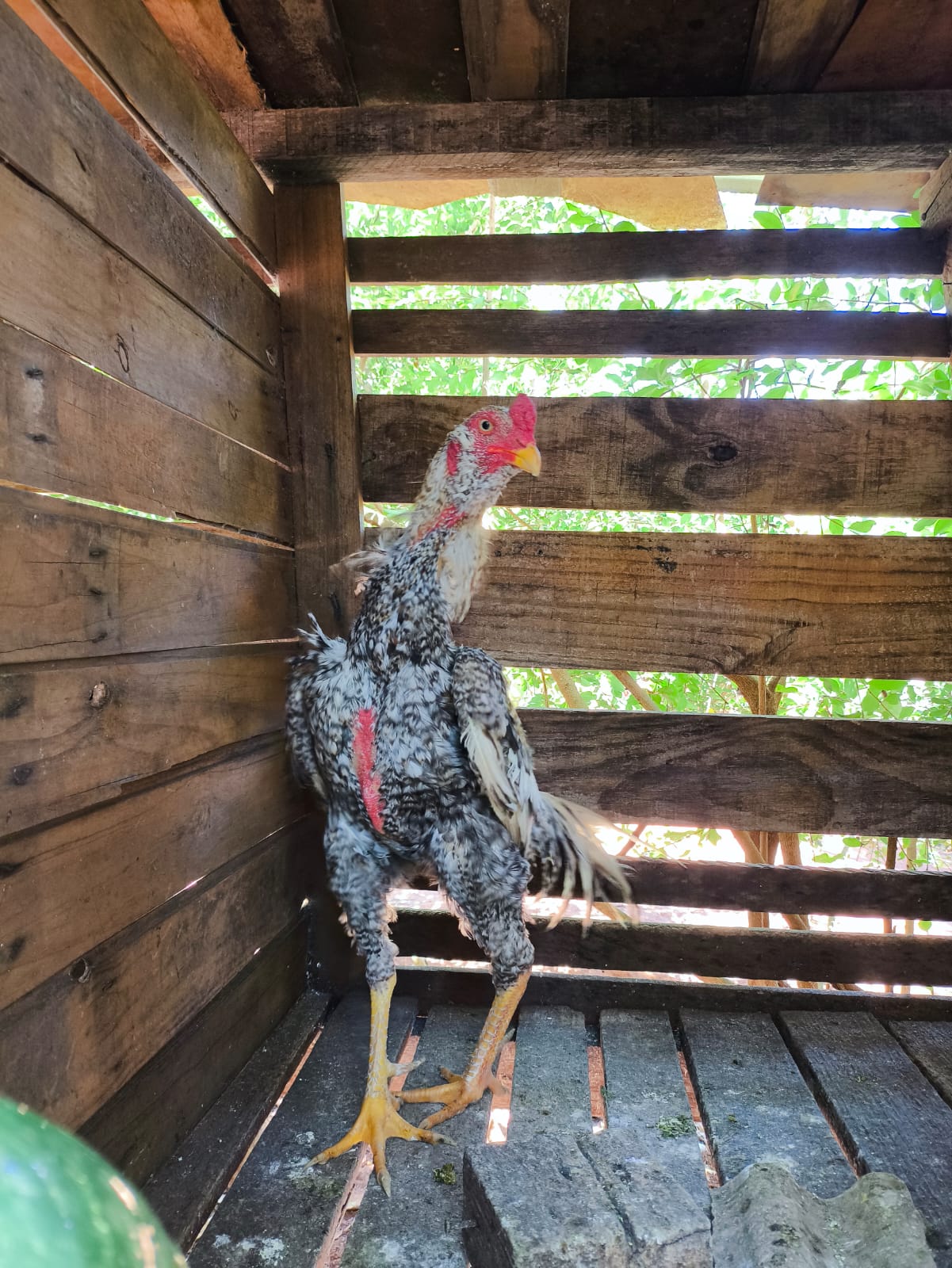 No terreno também foram localizados porcos, galinhas, patos e galos. Sete galos estavam confinados — cinco em uma estrutura de madeira e dois em gaiolas. Alguns apresentavam ausência de penas na região do peito e sob as asas, com a pele visivelmente irritada. No momento da vistoria, os animais não dispunham de água nem alimento.