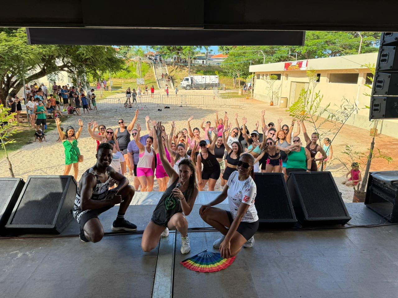 Fit Dance: Às 15h, uma multidão se reuniu para acompanhar a coreografia guiada, transformando o poliesportivo em uma grande pista de dança ao ar livre.