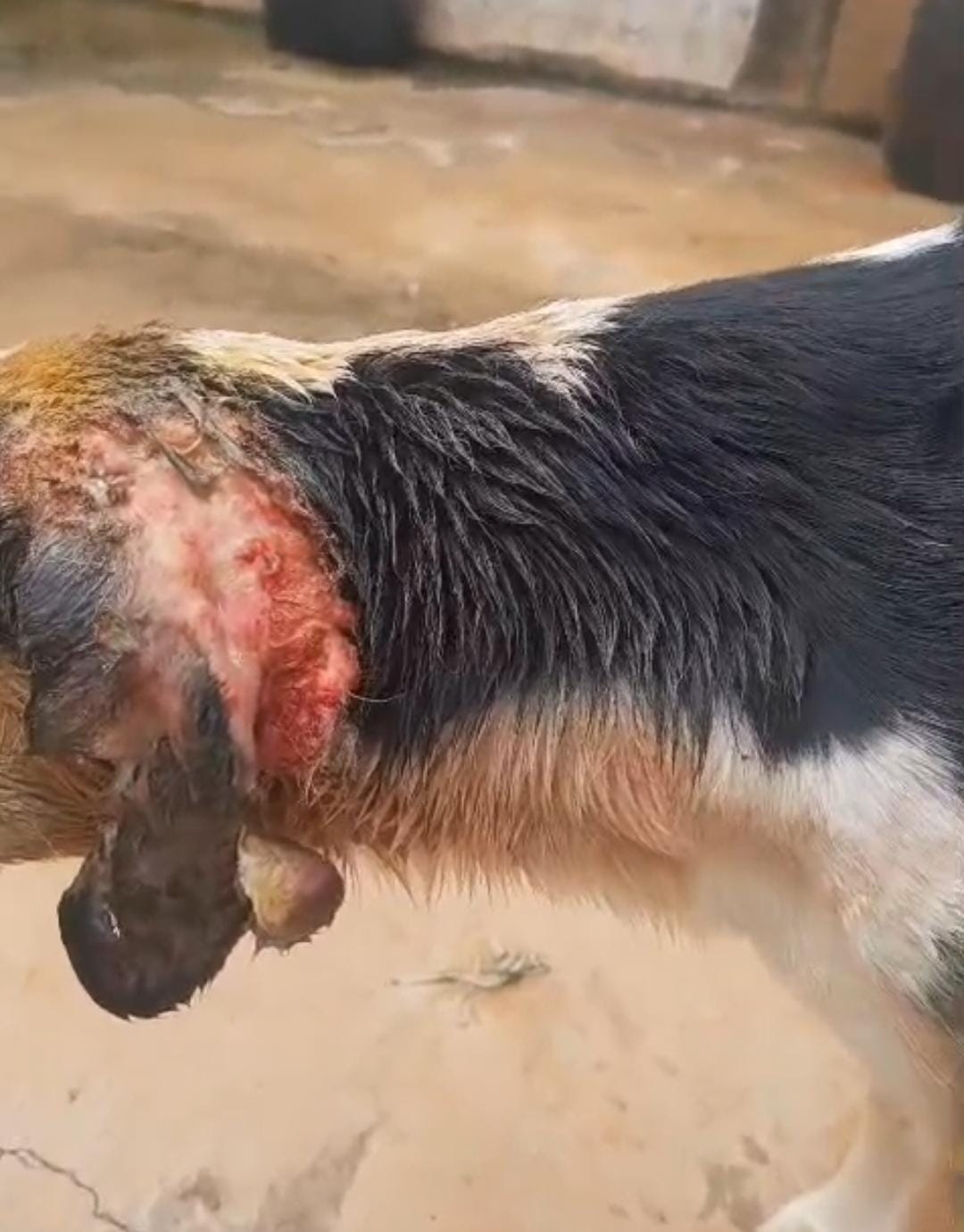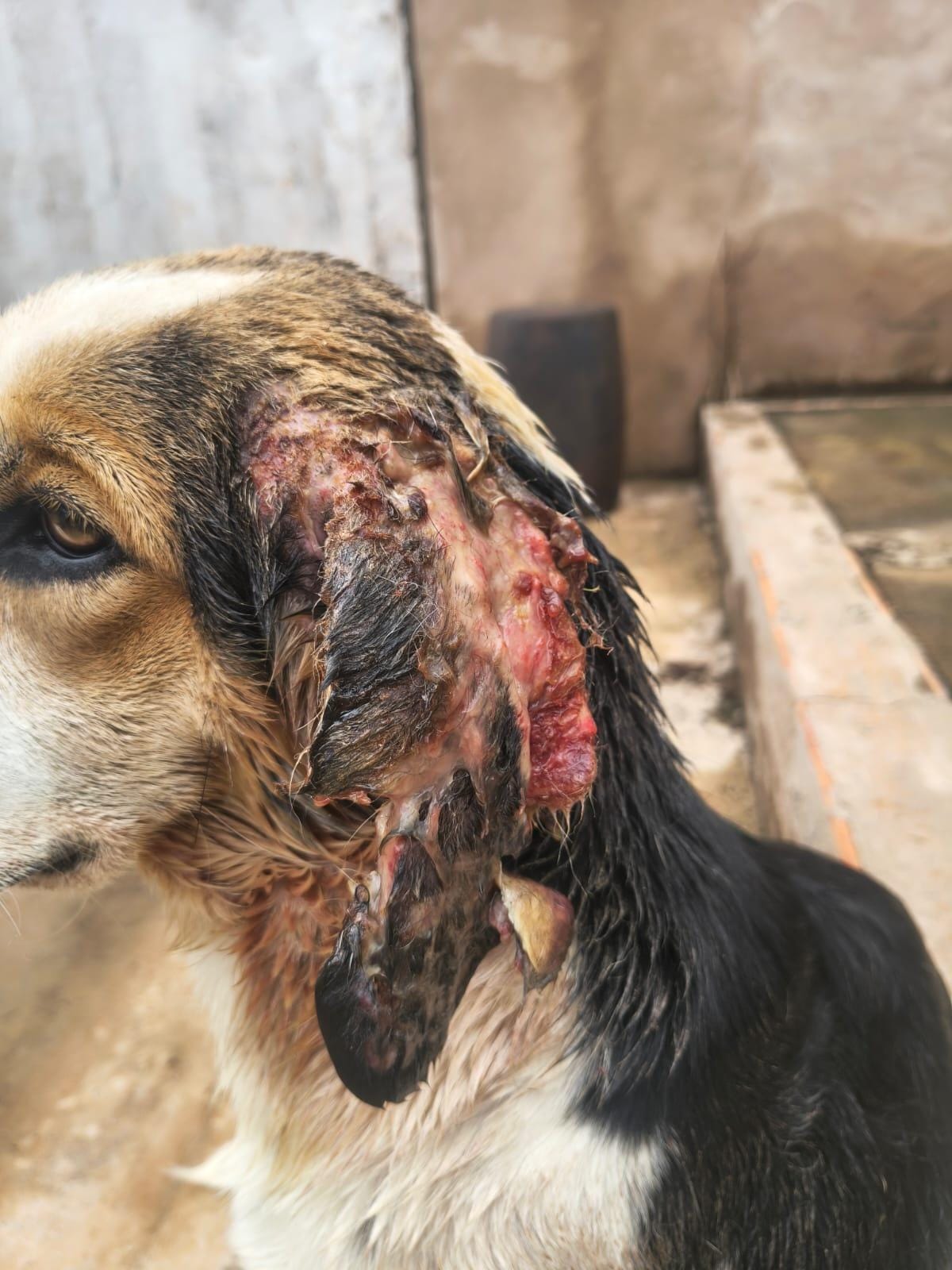 FOTO MOSTRA ORELHA DO ANIMAL COMPLETAMENTE INFECTADA E COM SANGRAMENTO.
