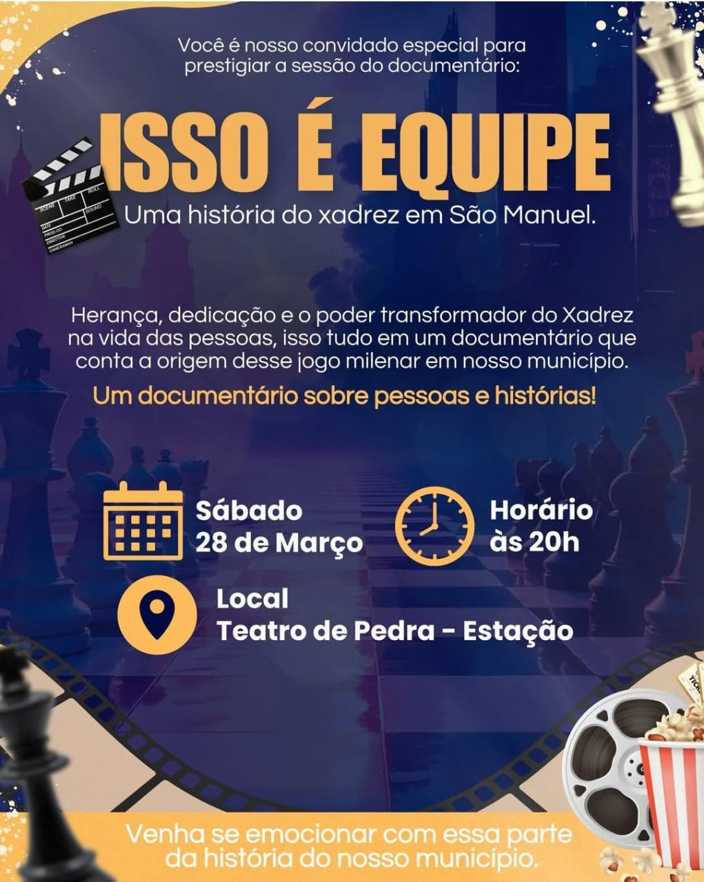 A cidade de São Manuel (SP) recebe, neste sábado (28), a estreia do documentário "Isso é Equipe". A produção mergulha nas origens do xadrez no município, apresentando o esporte não apenas como um jogo de estratégia, mas como uma ferramenta de transformação social e um legado que atravessa gerações.
