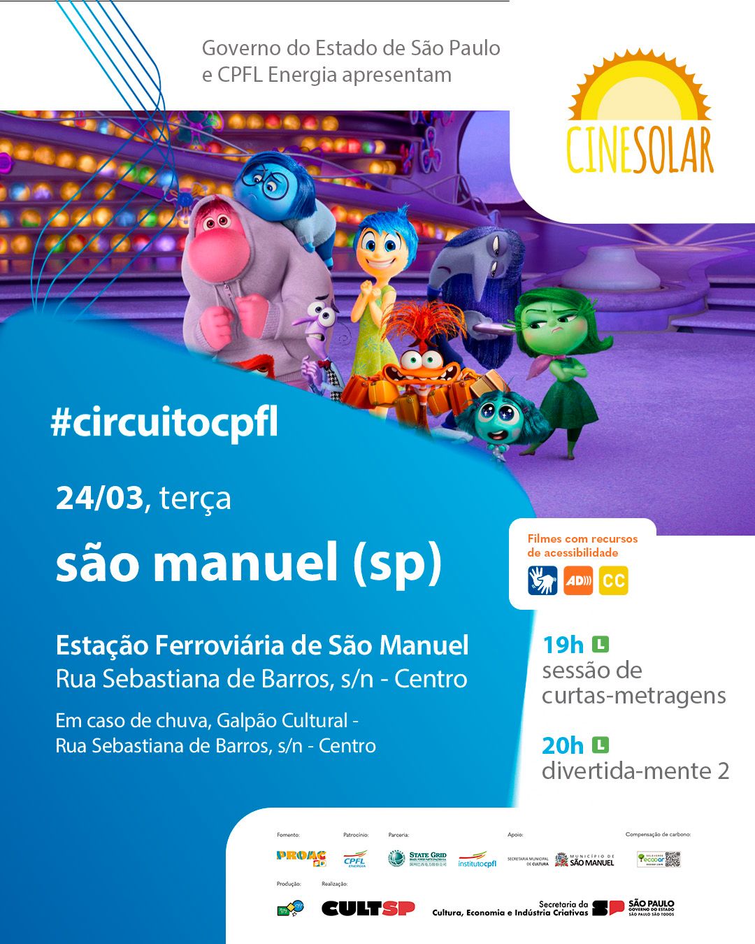 Evento na Estação Ferroviária terá exibição de "Divertida-Mente 2" e curtas-metragens com recursos de acessibilidade; entrada é livre.