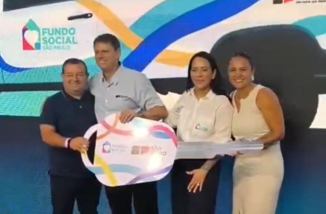 Na foto, o prefeito e a primeira-dama aparecem ao lado do governador de São Paulo, Tarcísio de Freitas, e da primeira-dama do Estado, Cristiane Freitas.