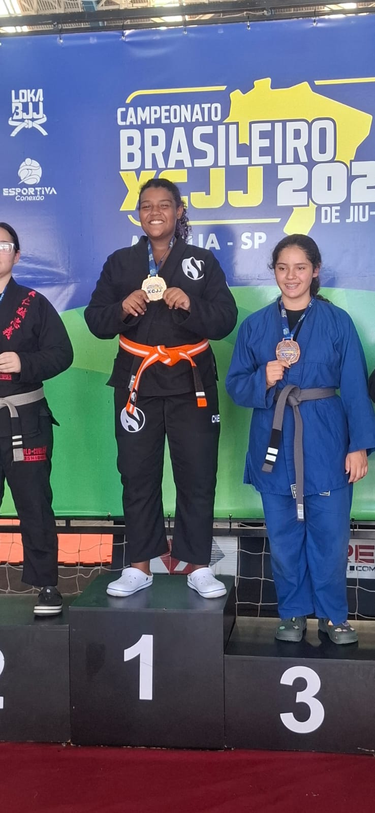 Nycole Modesto, de 12 anos, venceu duas lutas em sua categoria e subiu no lugar mais alto do pódio no Campeonato brasileiro xcjj