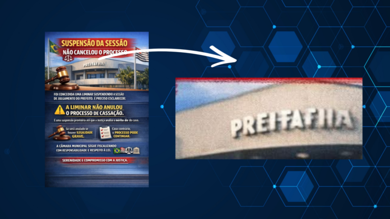 No topo do que deveria ser o prédio da Prefeitura ou da Câmara Municipal na imagem, lia-se claramente “PREIFATПIA”. A letra “П” (equivalente ao “P” no alfabeto cirílico) substituiu as letras “N” e “I” de “Pratânia”, criando uma palavra inexistente e evidenciando a falta de revisão humana na peça publicitária gerada pela máquina.