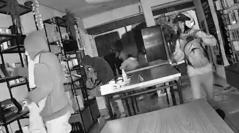 Já no interior da loja, o criminoso recolheu diversos produtos, como celulares e relógios inteligentes. Pouco depois, um carro parou na esquina e outras três pessoas desembarcaram para auxiliar no crime. Toda a movimentação durou cerca de dois minutos, conforme mostram as imagens.