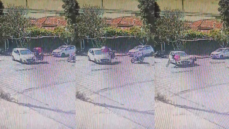 Imagens de uma câmera de segurança registraram o momento em que um carro avança a via preferencial e é atingido na lateral pela motocicleta. Com o impacto, o entregador é arremessado ao chão.