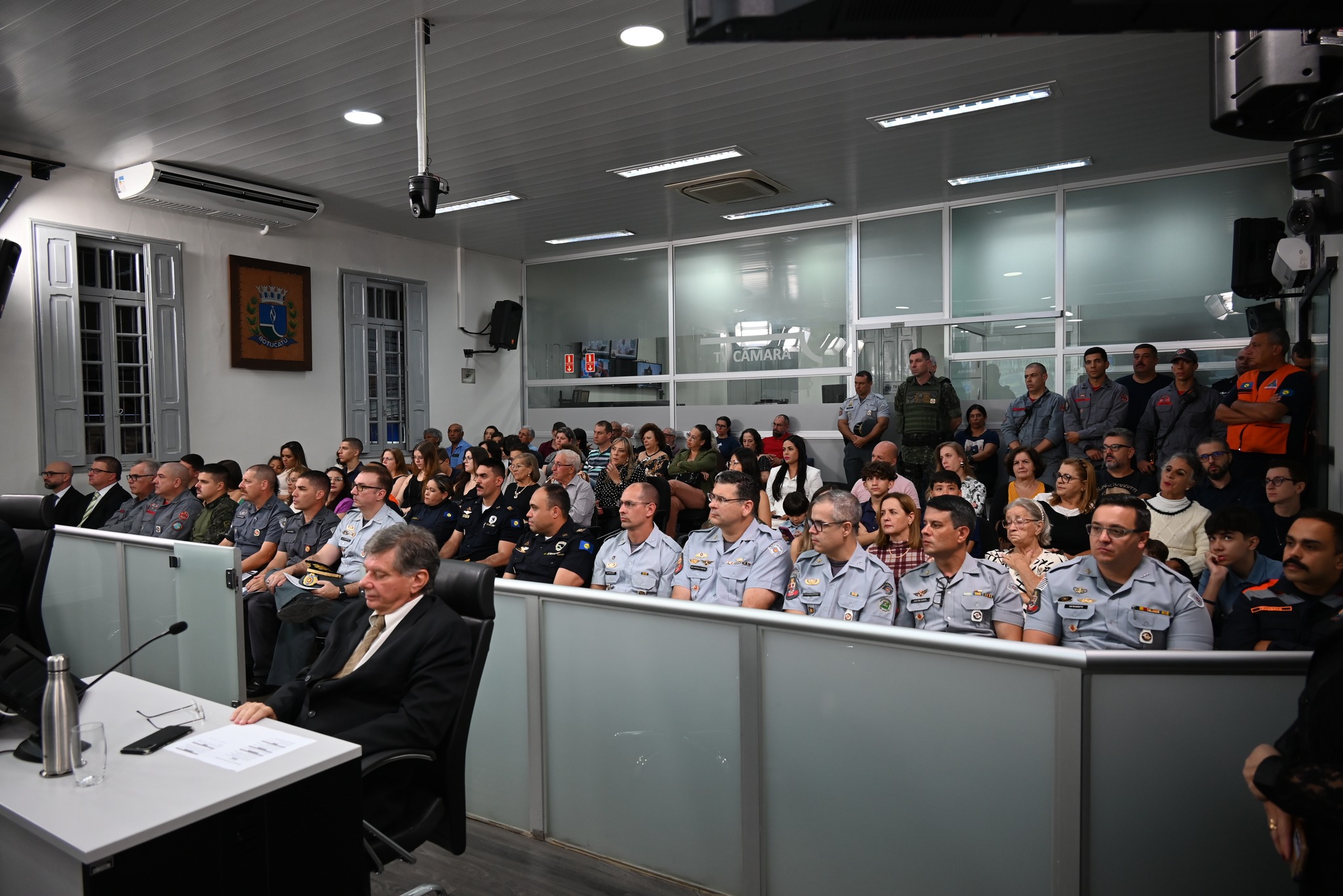 A honraria, instituída pelo Decreto Legislativo nº 457/2026, é uma premiação anual destinada a membros indicados pelas suas respectivas instituições. A Mesa dos Trabalhos contou com a presença de autoridades do Legislativo, da Polícia Militar, Polícia Civil, Guarda Civil Municipal e Tiro de Guerra.