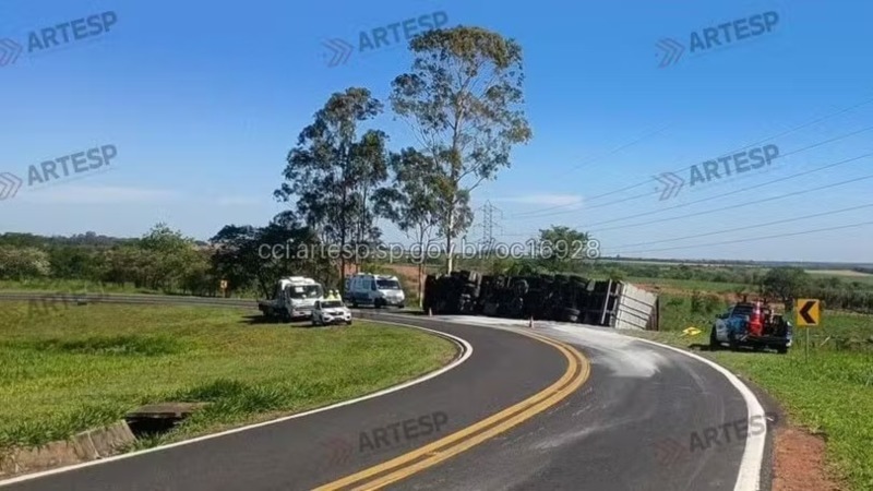 Caminhão tomba e interdita parcialmente Rodovia Manílio Gobbi em Paraguaçu Paulista