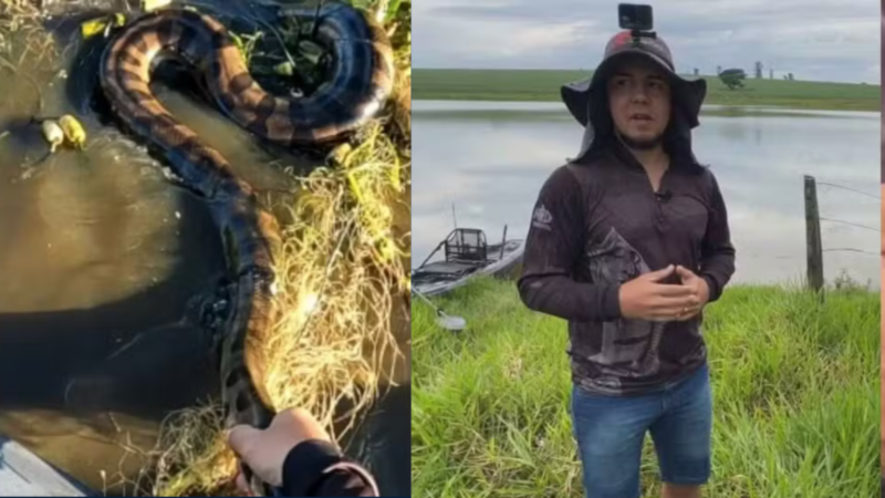 Pescadores salvam sucuri de quatro metros presa em rede abandonada no Rio Tietê; resgate durou 1h30